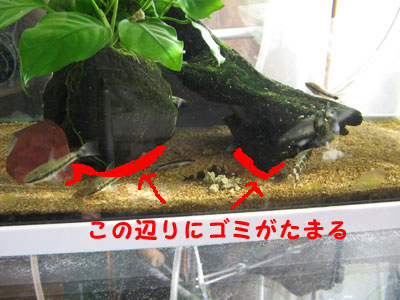 どうも岩や流木と砂利の接点あたりが汚れスポットなわけです。