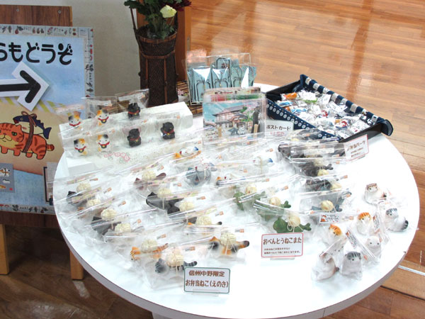 猫や限定のお弁当ねこ(おやき)やストラップ、ポストカードの